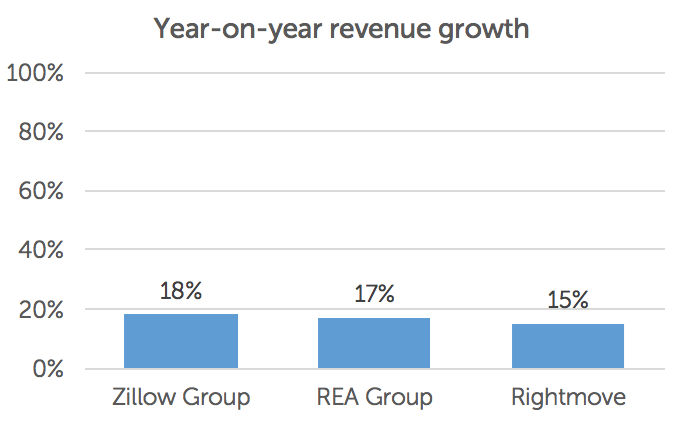 Again, based on the last full year’s financial results, Zillow’s pro forma revenue (which reasonably includes Trulia) grew by 18%, compared to Rightmove’s 15% and REA Group’s 17% (for their Australian operations only; total group was 20%).