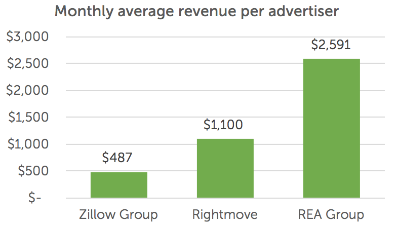 It’s difficult to get matching time periods, but here are the most recently reported ARPA numbers for Zillow, Rightmove and REA Group in the 2015/2016 timeframe. Clearly the international portals are able to better monetise their services than Zillow.