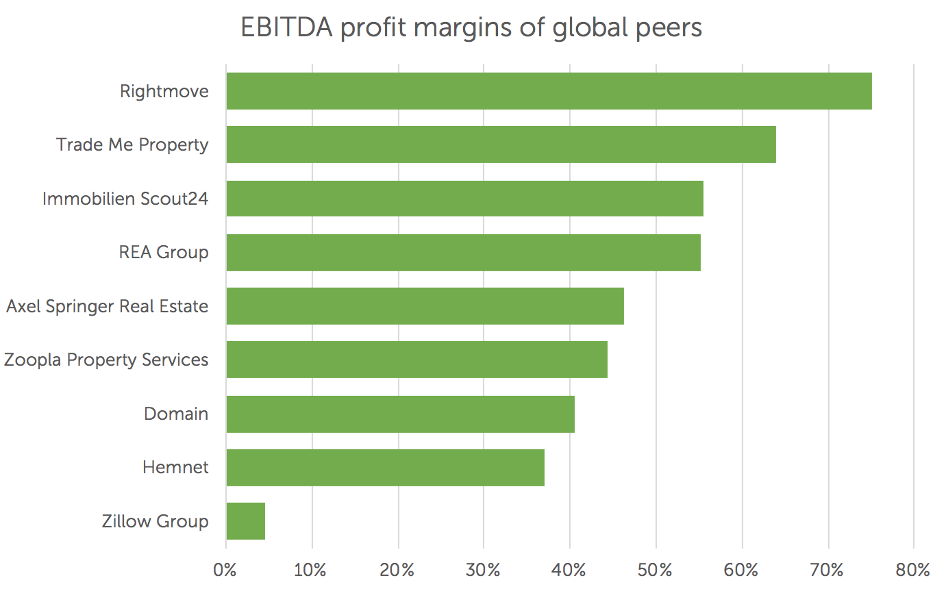 With 2016 revenues of $846 million and EBITDA of $37.9 million, Zillow has an EBITDA margin of 4.5% (far less than its reported 17% using Adjusted EBITDA numbers). As you can see below, that margin is well-below international peers.