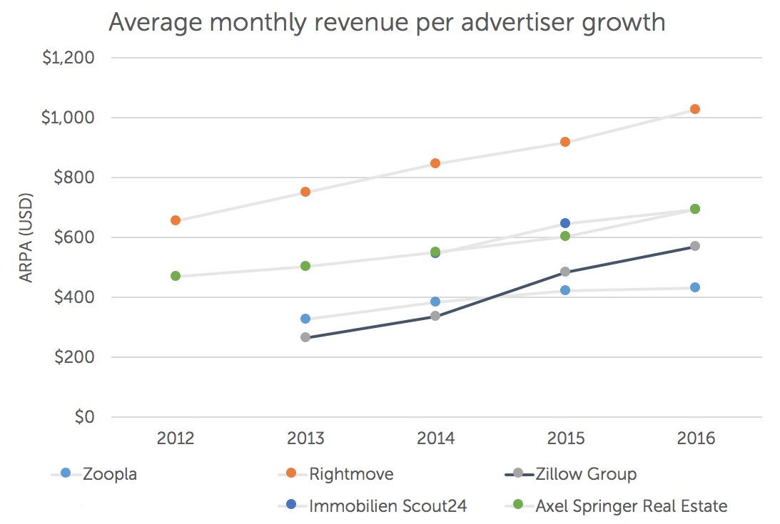 Let’s look at the average monthly revenue per advertiser (ARPA). The chart below highlights Zillow compared to international peers and suggests a nice uptick in ARPA, placing Zillow in the middle of the international pack. But it also suggests incremental, rather than exponential, room for growth.