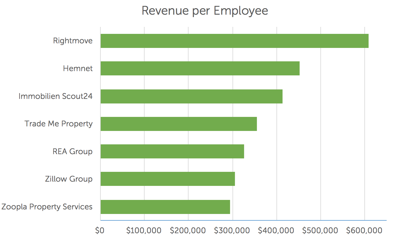 Zillow is again middle of the pack when it comes to revenue per employee. This suggests a limited ability for Zillow to monetize on a radically different expense base (in other words, it probably can’t extract much more revenue without adding more expensive headcount).