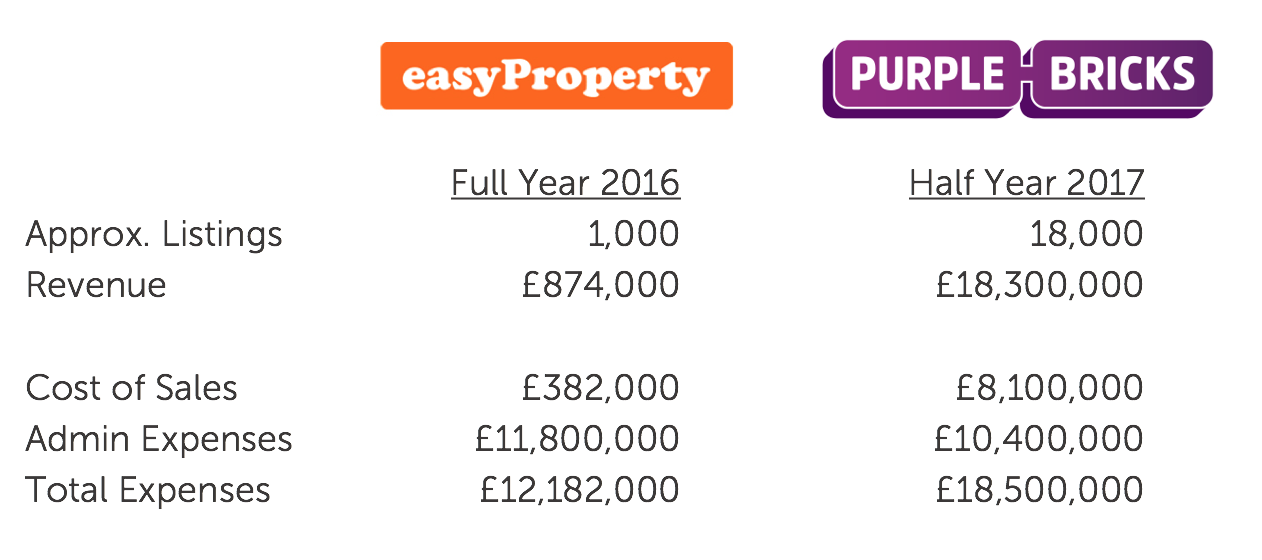 Let’s start with an overview using the most recent data available. For easyProperty, this is its full year 2016 results. For Purplebricks, we have its half-year 2017 results, announced last December.