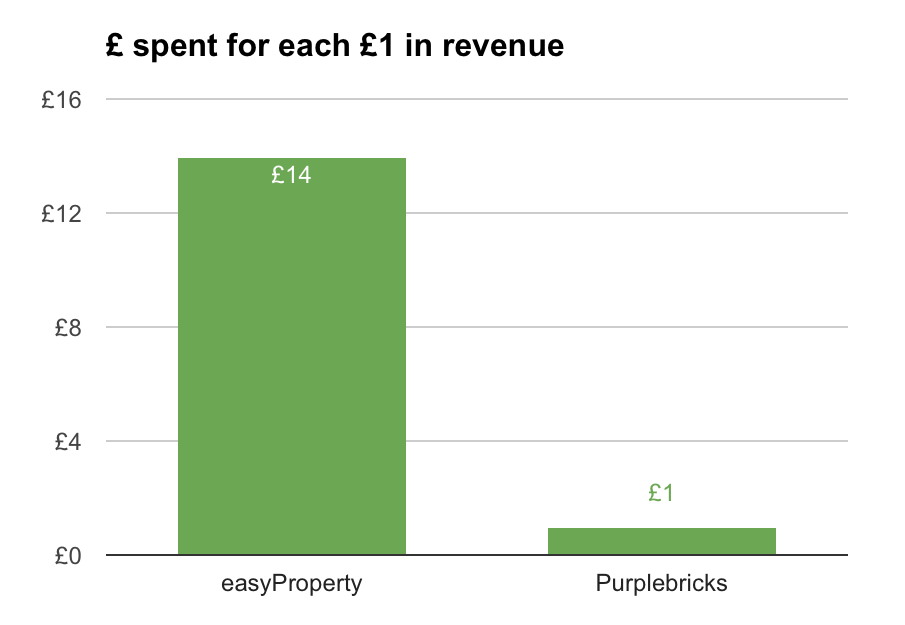 At a higher level, we can also look at how much easyProperty is spending for each £1 in revenue. Spoiler alert: it’s not pretty.