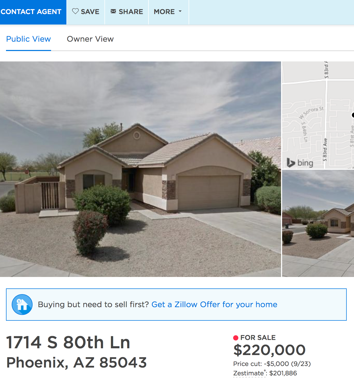 Zillow announced its Zillow Offers program in Phoenix earlier this year, and started buying houses in May. It is heavily promoting the program across its site. While looking in the Phoenix market, a prominent message is displayed on all active for sale listings.
