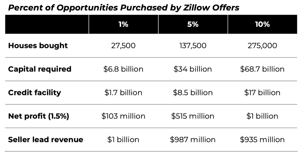 But to reach that scale, Zillow would need to spend $68 billion to purchase 275,000 houses annually. Assuming an average holding time of 90 days, it would need a credit line of $17 billion to fund the effort. Big numbers.