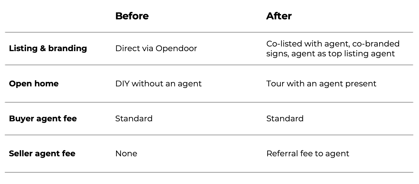 Before this program was announced, the way Opendoor sold its homes was fairly uniform: it would list direct without an agent, offer self-guided tours, brand everything Opendoor, and not pay seller agent fees since it was selling direct. But things have changed: