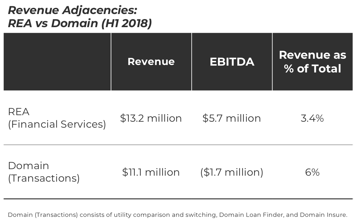 In Australia, both REA Group and Domain have launched adjacent businesses in financial and transaction services. For REA, this represents a small, but profitable, percentage of total revenue.