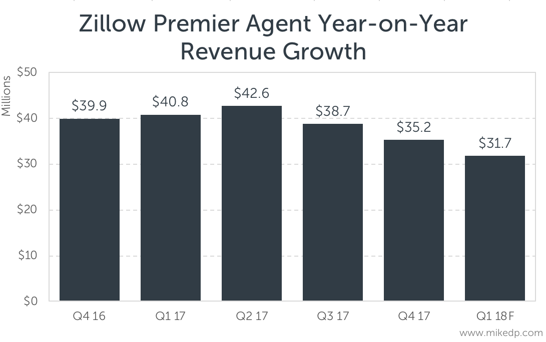 Zillow's year-on-year premier agent revenue growth, broken down by quarter, shows a clear trend of slowing growth. Keep in mind this is off a large revenue base ($760 million annually) so is to be expected. But the trend is clear: growth is slowing.