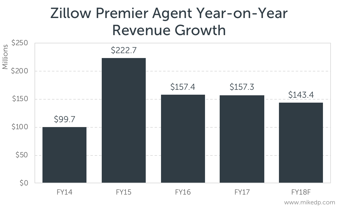 Other revenue streams, such as display advertising, mortgage leads, and rentals, form a small percentage of overall revenue. Zillow is very much a business centered around -- and reliant on -- its premier agent program. So it is natural to focus on premier agent revenue growth to frame the future prospects of the business.
