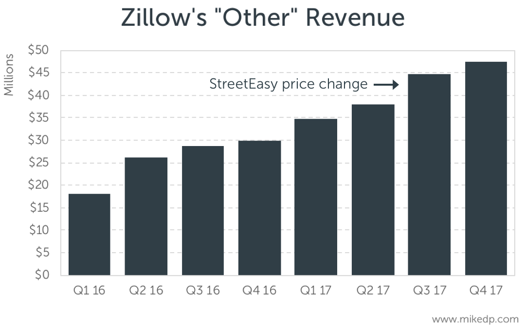 One area where Zillow is seeing strong growth is in rentals, where it saw a 124 percent increase in revenue. This is undoubtedly driven by the decision to start charging for rental listings on StreetEasy in NYC in July of last year. You can see the corresponding bump in revenue below.