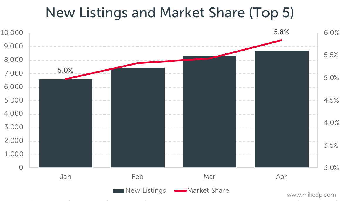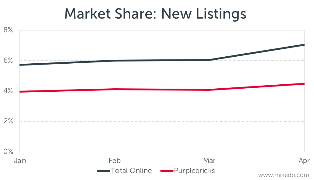 Overall new listings market share for the online agents is up from 5.7% in January to 7.1% in April. In that same period of time, the leader Purplebricks increased its market share from 4% to 4.5%.