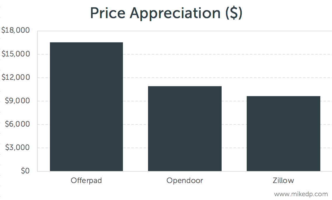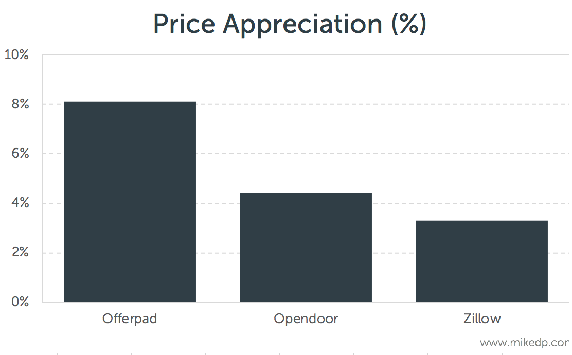 For the iBuyer model to work, the home must be sold for more than its purchase price. I call that price appreciation. As a percentage, the price appreciation on the 10 homes Zillow has sold is 3.3 percent.