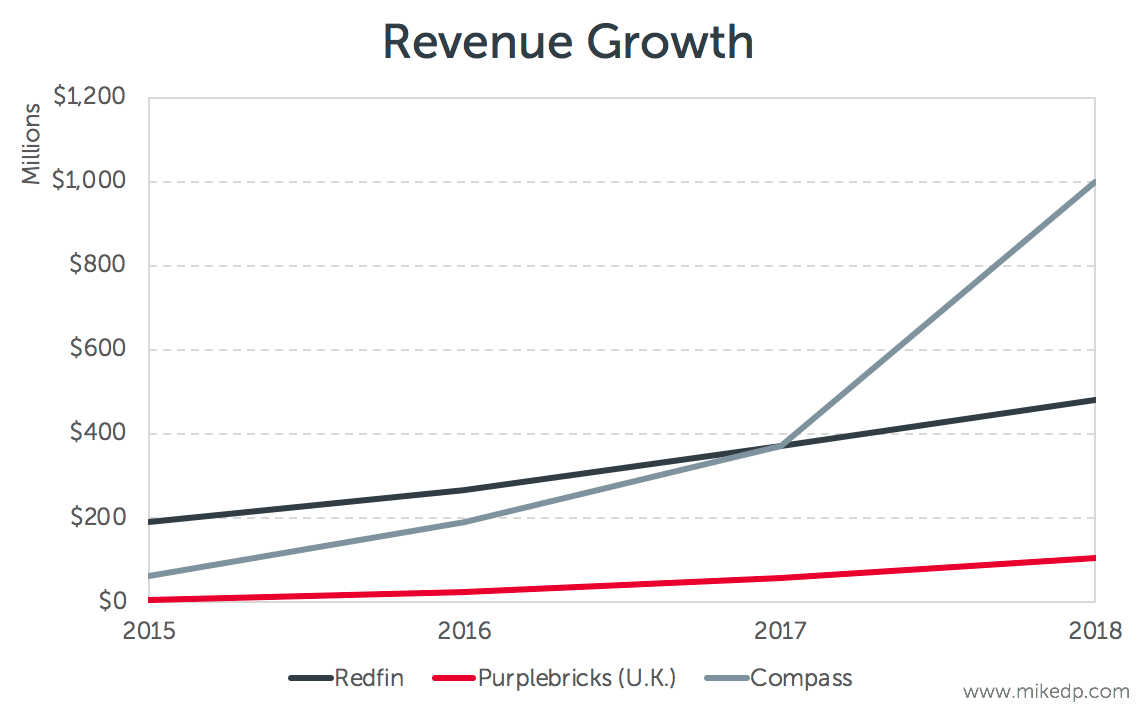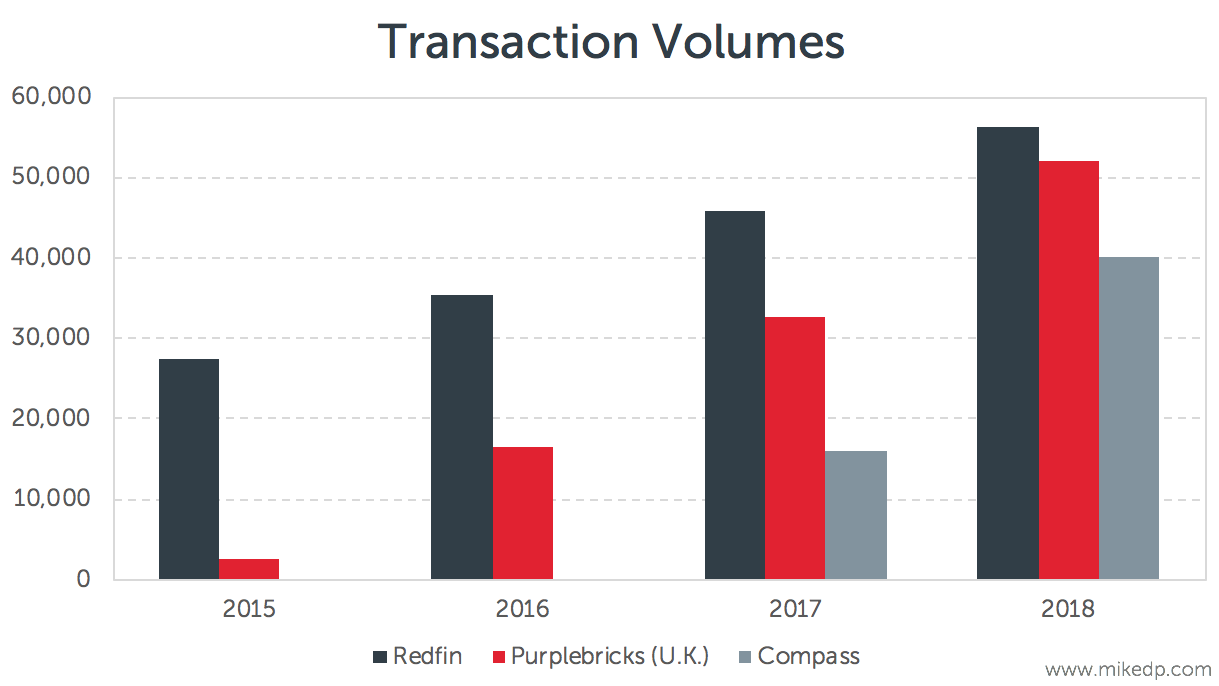 Transaction volumes are all increasing. Again, Compass' projected growth in 2018 is impressive, but that's what happens when you buy market share. By comparison, Redfin and Purplebricks are growing organically.
