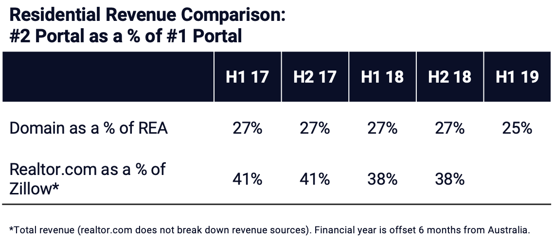 One metric to compare portals is overall revenue generation. In general, the #2 portal generates between 25 and 40 percent the revenue of the leader (read my portal report), and that number doesn't fluctuate over time. In fact, in the case of REA Group and Domain, the leader is growing faster than the number two.