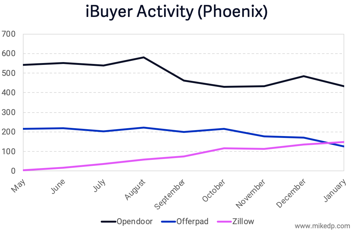 Zillow's overall iBuyer activity continues to grow, both nationally and in Phoenix (its biggest market). Based on the total number of homes purchased and sold, Zillow overtook Offerpad to claim the #2 spot in Phoenix for the month of January. Zillow is -- for the moment -- the second-largest iBuyer in the important Phoenix market.