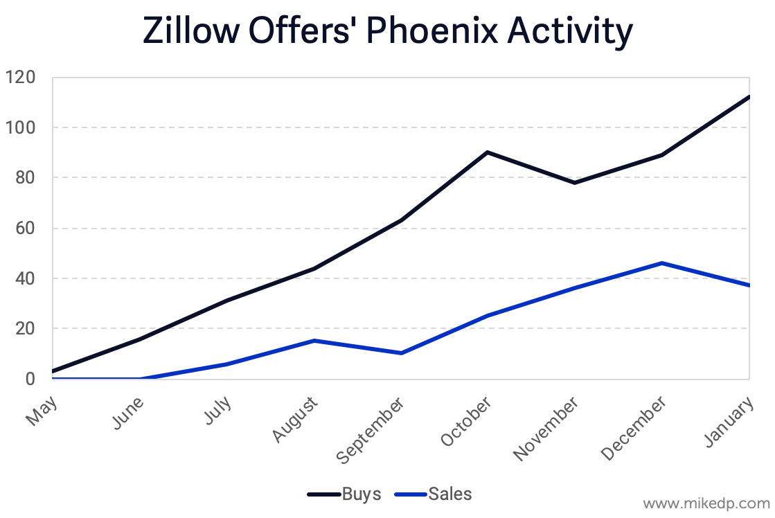 While Zillow's overall activity continues to rise, its purchases are quickly outpacing sales. This is to be expected in the early months of a new market, but it's now eight months since launch. This is creating a growing inventory of unsold homes: around 350 in Phoenix as of February 12th.