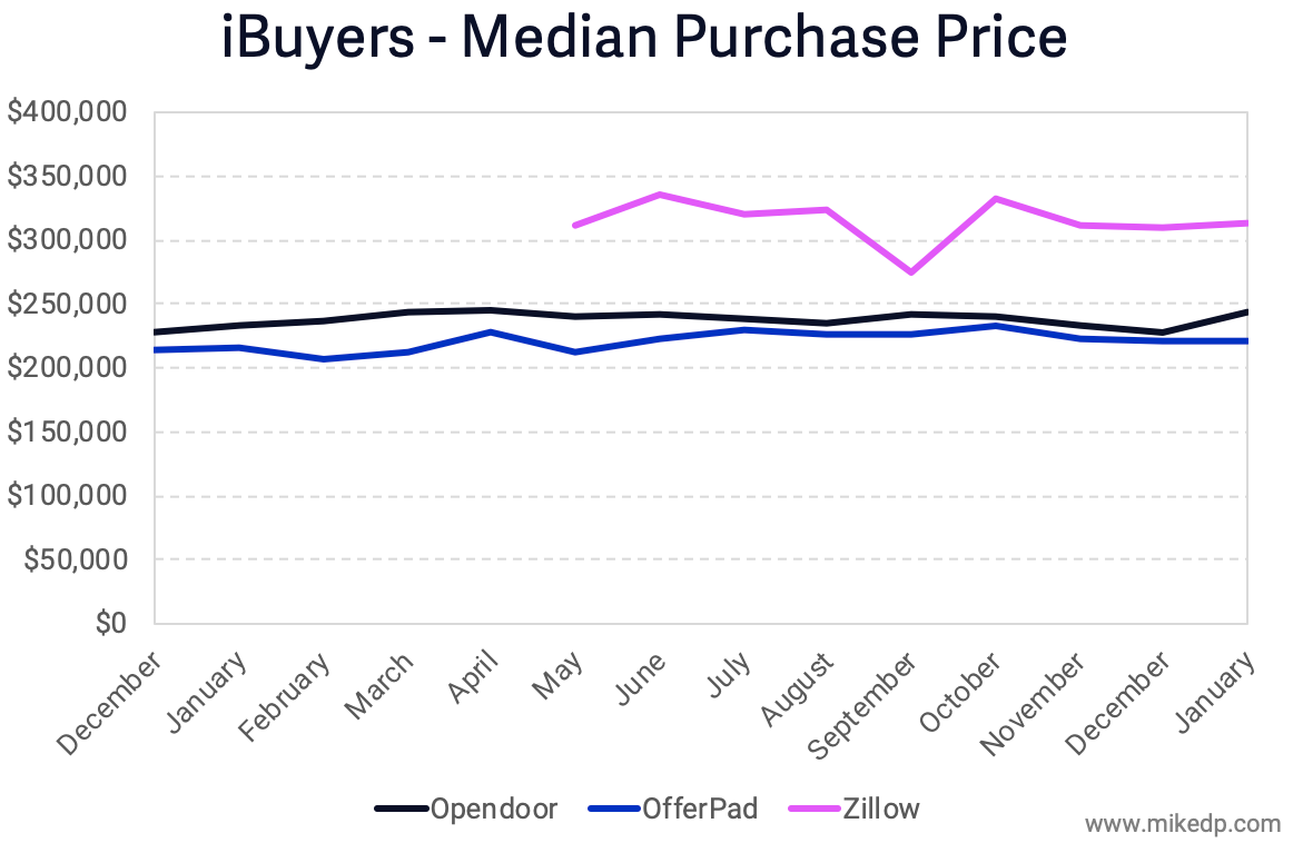 Part of the reason Zillow appears to have longer holding times may be the price of the homes it is purchasing. On average, it is buying more expensive homes than the other iBuyers in Phoenix.