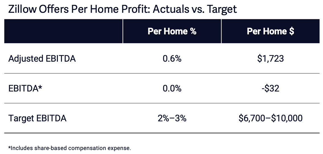 Zillow released a detailed financial breakdown for its Offers business, including initial profit margins on its sold homes. Adjusted EBITDA, which backs out a number of costs including stock-based compensation, shows a per-home profit margin of 0.6 percent, lower than the stated goal of 2–3 percent.