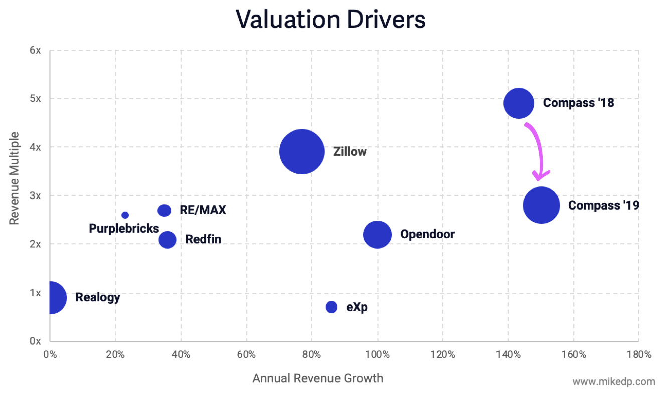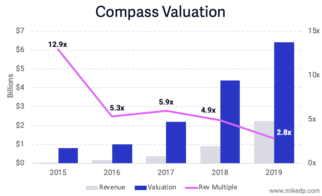 Revenue multiples are generally based on future growth rates. One could argue that as Compass gets larger and its growth rate slows, its revenue multiple will naturally fall. However, Compass' growth in 2019 appears to be the same as it was in 2018: 150 percent. Compass' lower revenue multiple does not appear to be tied to a slowing growth rate.