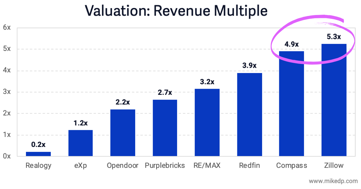 One of the key questions I explored in my deep dive analysis of Compass is whether it is being valued as a technology company or a brokerage. At the time, it was clearly being valued as a technology company, with a revenue multiple of 4.9x -- well above traditional brokerages and much closer aligned to Zillow.