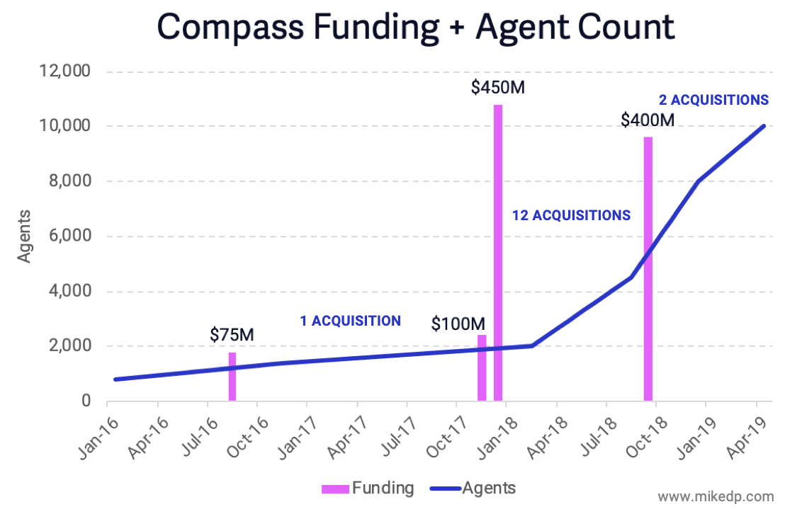 Compass’ business model is fueled by capital. It has raised more than $1.5 billion, which it is using to acquire brokerages and recruit agents at an unprecedented scale. It is turning dollars into agents, which in turn generate revenue.
