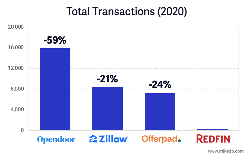 All of the major iBuyers saw a significant drop in 2020 compared to 2019, but Opendoor stands out for several reasons. First, it remains the largest iBuyer, with around 2x the transactions of its closest competitors. But it also saw the biggest year on year drop in volumes: down about 60 percent from 2019.