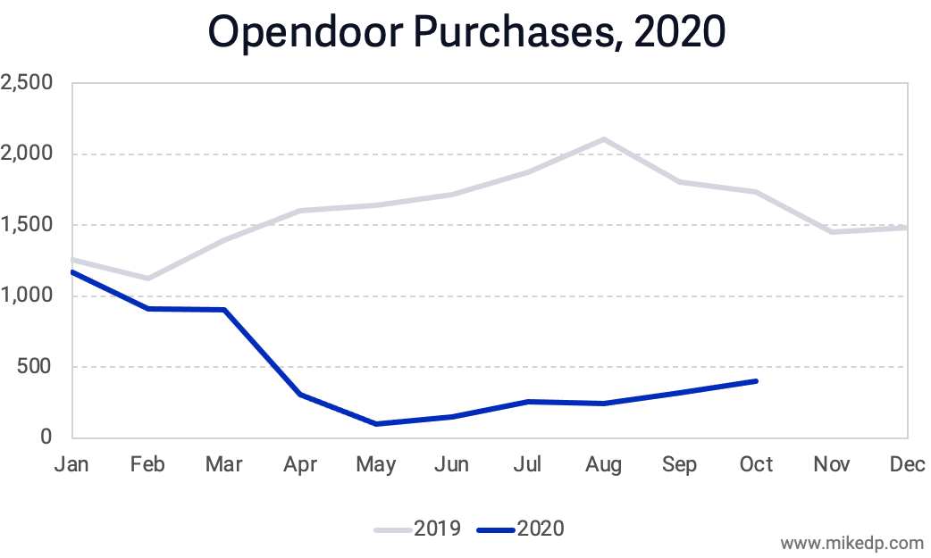 This is a reflection of both Opendoor's high-flying activity in 2019, and its painfully slow post-lockdown recovery. Opendoor's purchases are still down over 70 percent from the same time last year. Recovery is slow; much slower than the overall market.