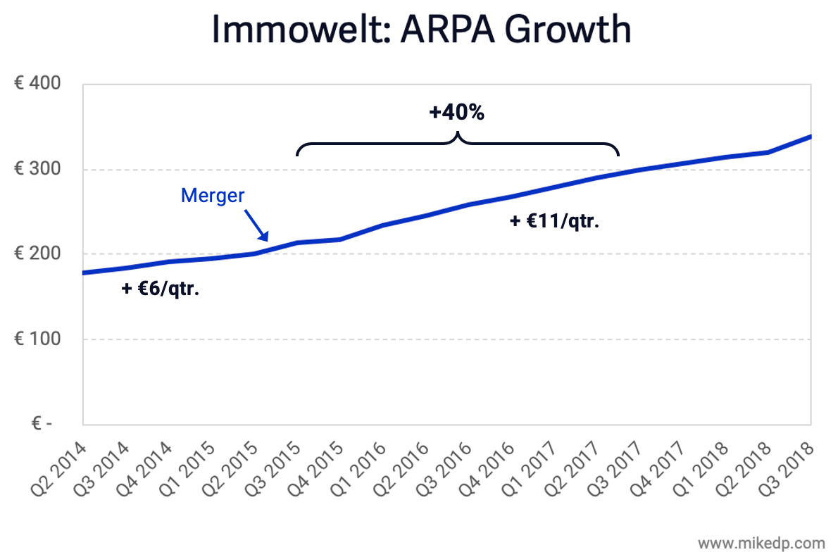 In 2015, Axel Springer brought together Immowelt (IW) and Immonet (IN), the #2 and #3 real estate portals in the German market. The combined entity managed to increase ARPA (average revenue per advertiser) 40 percent over the following two years, with only 5 percent customer churn -- a noteworthy achievement.