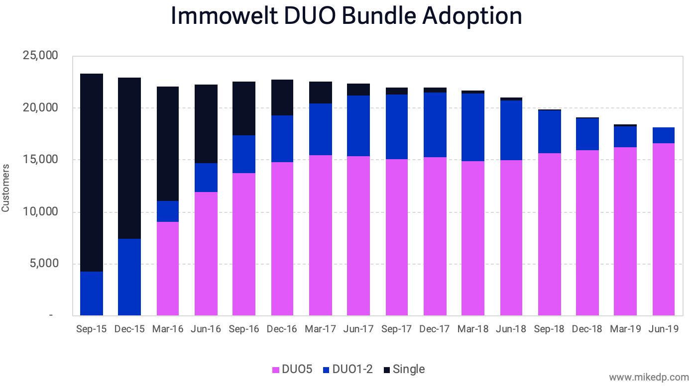 In 2018, Immowelt began converting customers to a more expensive DUO5 (five listings) bundle. Over the subsequent two years, customer churn increased to 19 percent while ARPA growth remained high at 33 percent.