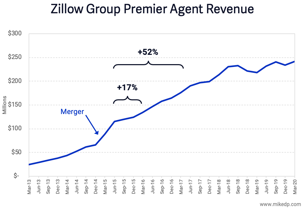 The merger increased the market dominance of the combined entity, and allowed Zillow to increase its pace of revenue growth over the following three years.