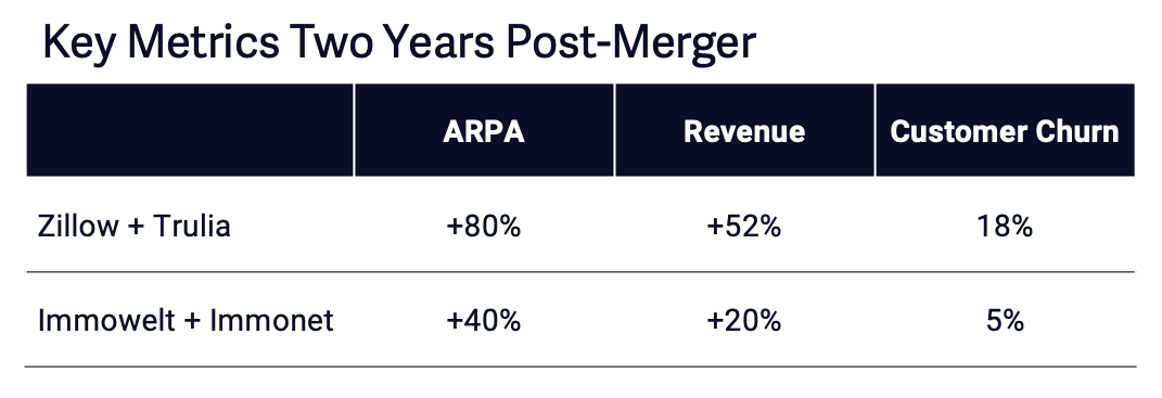 In the case of Zillow and Trulia (and similar to Immowelt and Immonet in Germany), post-merger revenue growth was driven by ARPA and not an increase in paying customers. In the year following the merger, and after the customer bases were consolidated, the number of paying customers dropped by 11 percent while ARPA increased 42 percent.