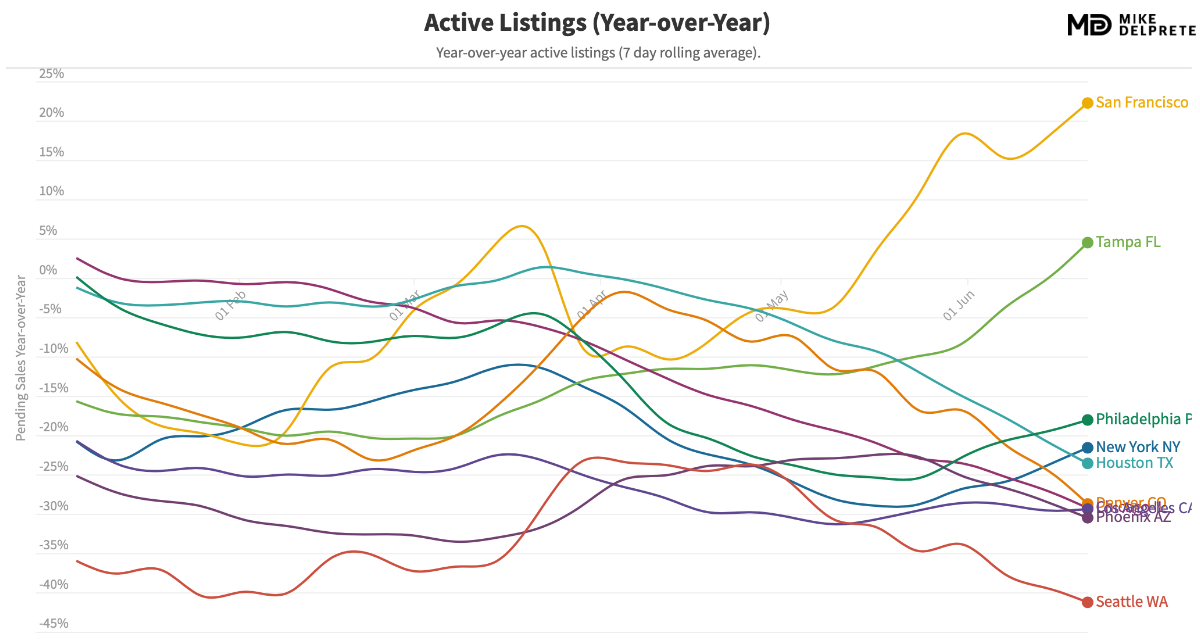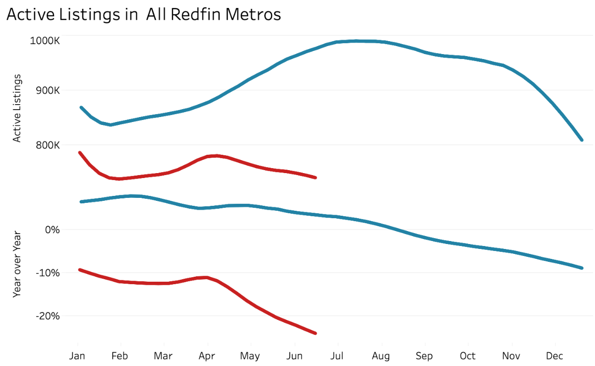 The significance is that when new listings stop coming to market, overall supply -- inventory -- drops. There are less available homes for prospective buyers to purchase. Nationally, the number of active listings is down 25% as of June 21st. And the slope of the line is heading down, both absolutely and compared to last year.