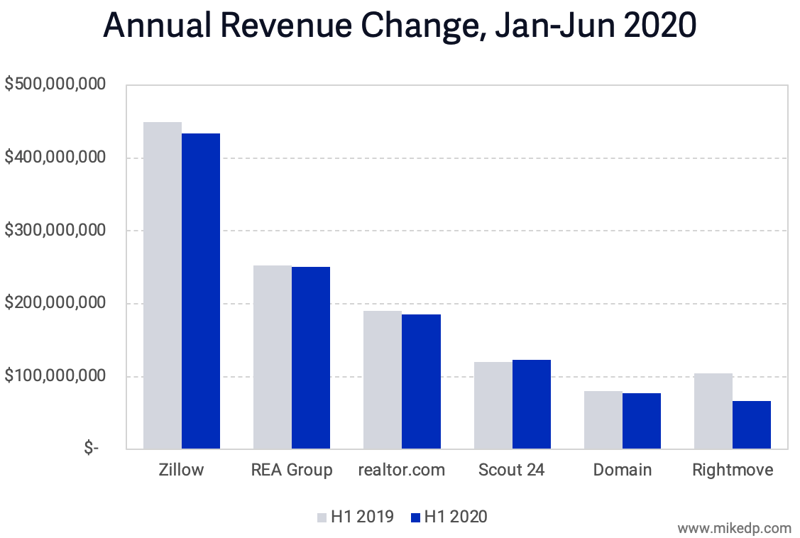In absolute dollar terms (and in local currency), Rightmove again tops the list, with revenues dropping a massive £38 million year-over-year. Zillow lost a substantial $15 million, but from a much larger revenue base ($450 million vs. Rightmove's £105 million in H1 2019).