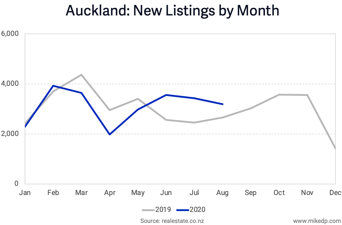 The national drop in new listing volumes was driven by the country's largest market, Auckland. However, looking at only Auckland reveals a less severe impact than one might expect. The drop in new listings is noticeable, but marginal, and new listings are still higher than the same time last year.