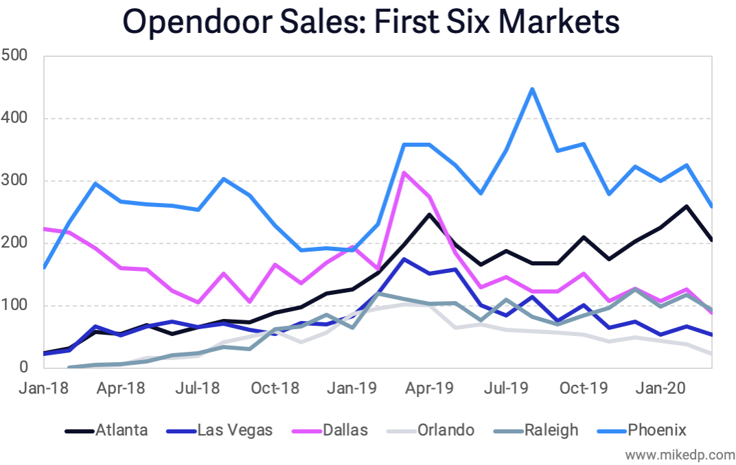 The growth of new markets is not a straight line up and to the right. In Opendoor's case, new markets experienced initial growth followed by a plateau. This is either a deliberate beachhead strategy, or reflective of a larger challenge reaching scale.