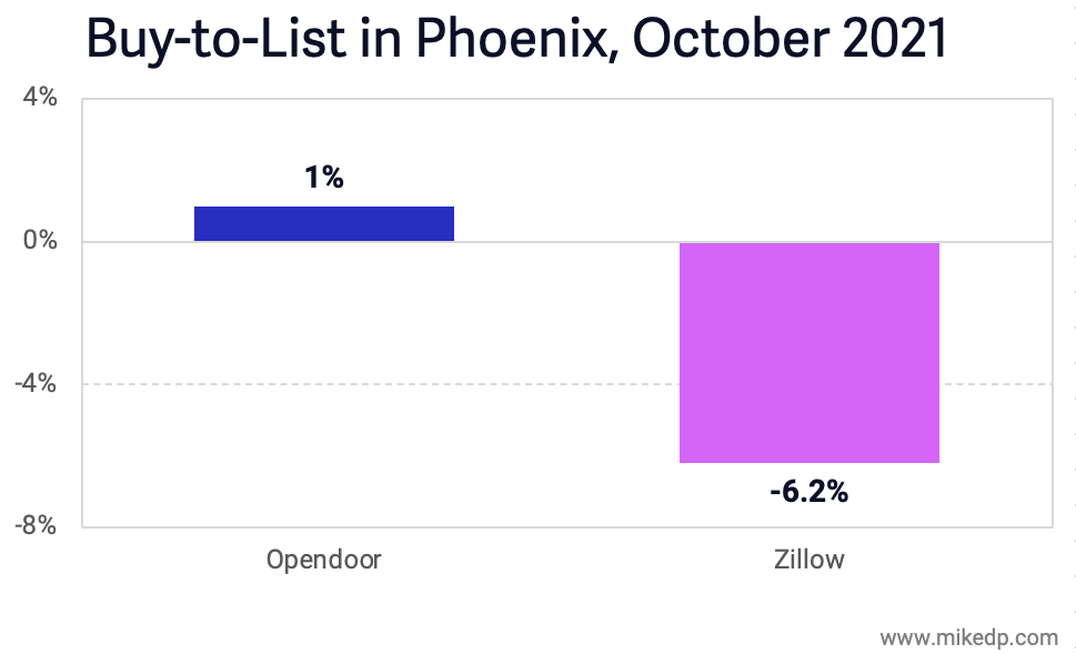 In Phoenix, Zillow's 250 current listings are priced at a median of 6.2 percent below what they were bought for (the "buy-to-list" metric).
