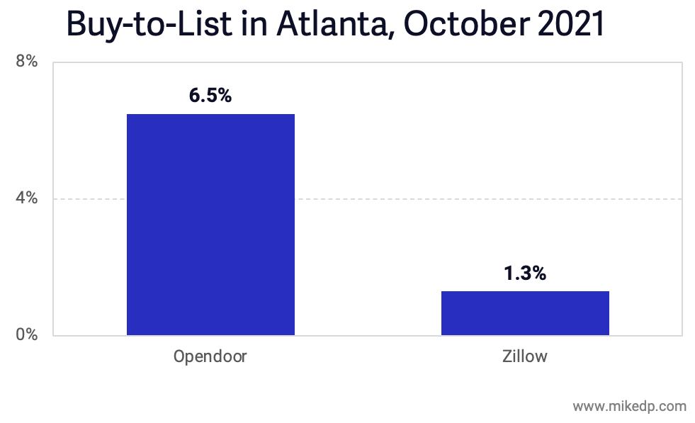 The trend is similar -- but not as bad -- in other markets. In Atlanta, Zillow's median buy-to-list is still positive, but down considerably from past months (and again worse when compared to Opendoor).