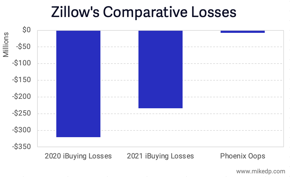 But it won't stop Zillow; the loss, relative to its total investment in iBuying, is small. Sold today, Zillow’s Phoenix listings would incur a loss of $7 million. That’s a fraction of Zillow’s total iBuying losses of this year and last.