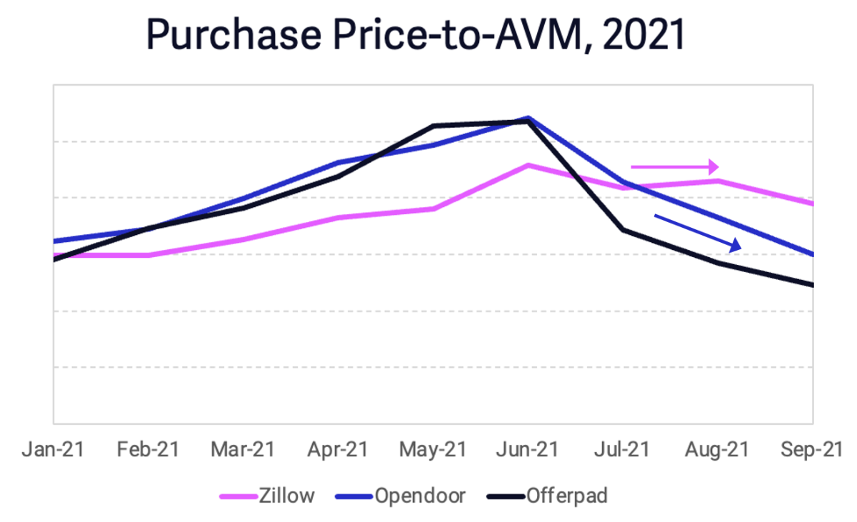 Zillow's unintentional purchase of homes at high prices contrasts nicely with Opendoor's intentional purchase of homes at lower prices. Beginning in July, as the market began to cool, Opendoor and Offerpad began paying less for homes, while Zillow continued to pay top dollar.