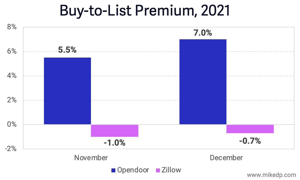 The best leading indicator of effective and accurate pricing is the buy-to-list premium; the difference between the purchase price and current listing price of a home. Unlike Opendoor, Zillow overpaid for the homes it acquired and is selling them for a loss; a negative buy-to-list premium, and a big problem.
