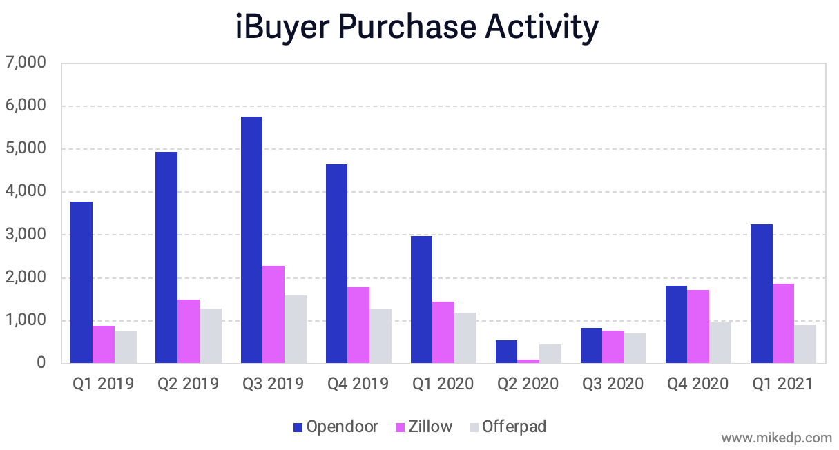 The pandemic of 2020 brought iBuying to a grinding and dramatic halt. The major iBuyers -- Zillow, Opendoor, and Offerpad -- have slowly recovered, with total purchases in Q1 2021 finally rising to the levels of the same period last year.