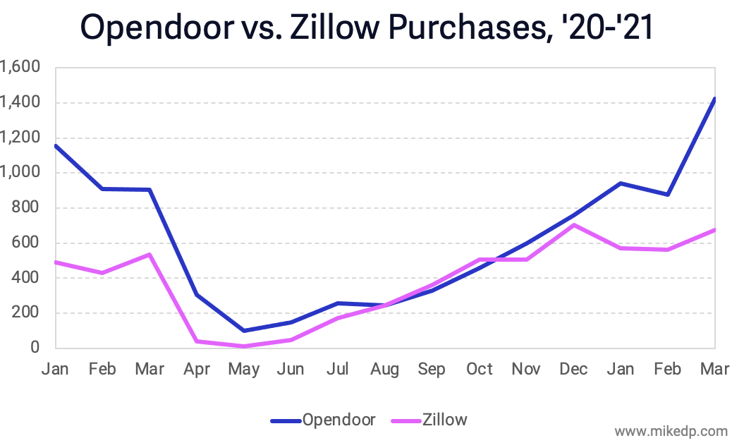 Before the pandemic, Opendoor was the clear category leader, purchasing over twice as many houses per month as Zillow. The lockdown was the great equalizer; both companies dropped to near zero, and recovered at the same pace throughout 2020. However, in the first quarter of 2021, Opendoor again pulled ahead while Zillow took its foot off the accelerator.