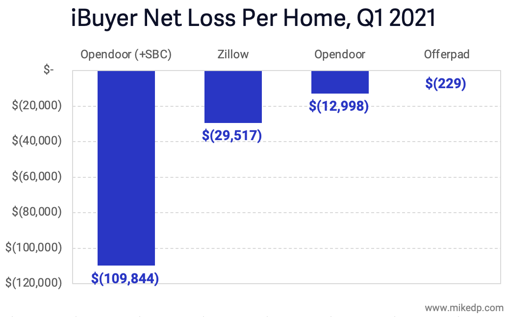The Offerpad story presents the clearest signal yet that iBuying can become profitable. Its latest Q1 2021 numbers show a business only losing $230 per home bought and sold -- a breathtaking achievement compared to losses of tens of thousands of dollars per home at Opendoor and Zillow.