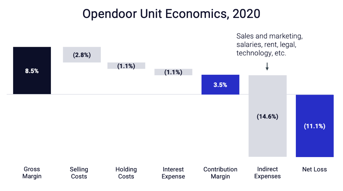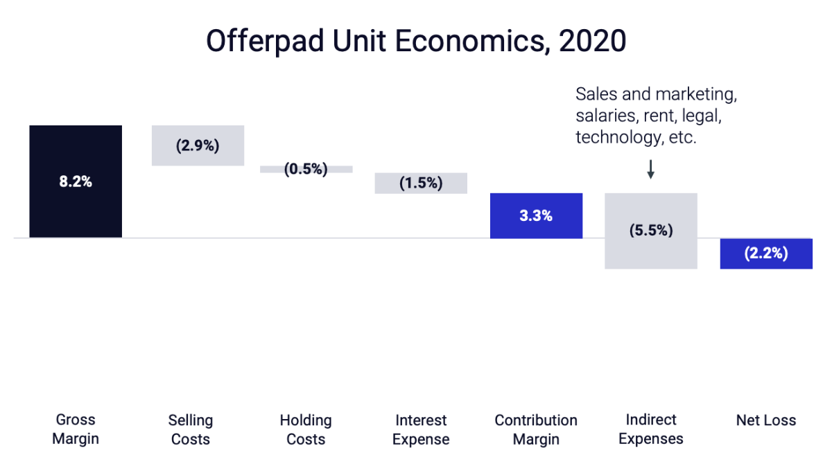 The unit economics between the two companies are nearly identical. But as a percentage of revenue, Offerpad's indirect expenses were 5.5 percent in 2020, compared to Opendoor's 14.6 percent (and Zillow's 17.5 percent). This is the key difference driving profitability.
