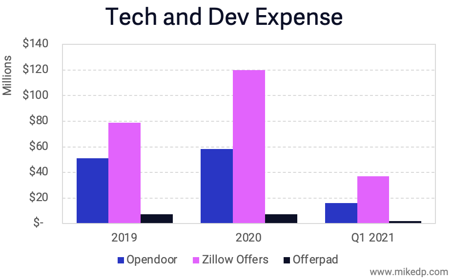 The iBuyers have vastly different approaches to their technology investment; Opendoor is spending about eight times more on technology and development than Offerpad (and both companies are dwarfed by Zillow -- but given Zillow's wider technology ecosystem, I'm going to focus on an Opendoor comparison).