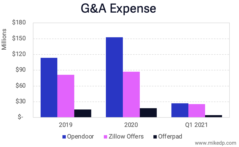 Offerpad's General and Administrative (G&A) expense -- think of it as general corporate overhead -- is also well below its peers. Again, Opendoor is outspending Offerpad by a factor of eight.