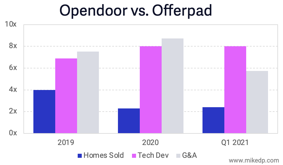 The differences in investment aren't explained by volume. In 2019, Opendoor sold about 4x the houses as Offerpad, but its overhead and tech costs were about 7x higher. In 2020, Opendoor sold about 2x the houses as Offerpad, and its overhead and tech costs were about 8x higher (a trend that continues into 2021).