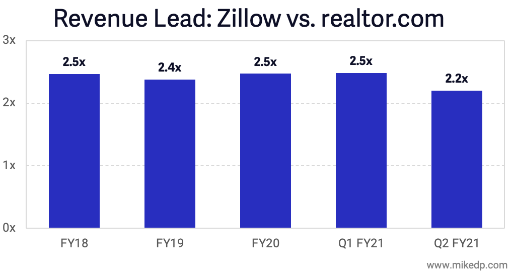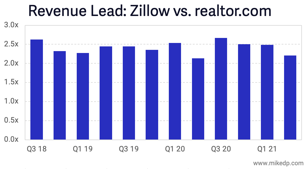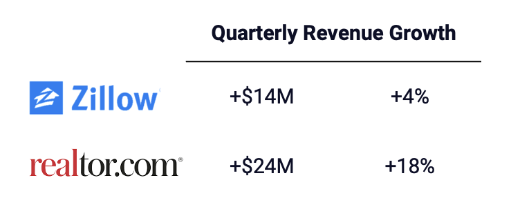 Since the last quarter, Zillow increased its premier agent revenues by $14 million, or 4 percent, compared to an increase in realtor.com's real estate revenues of $24 million, or 18 percent. These are each company's agent lead gen programs, and don't include adjacencies like iBuying and mortgage.