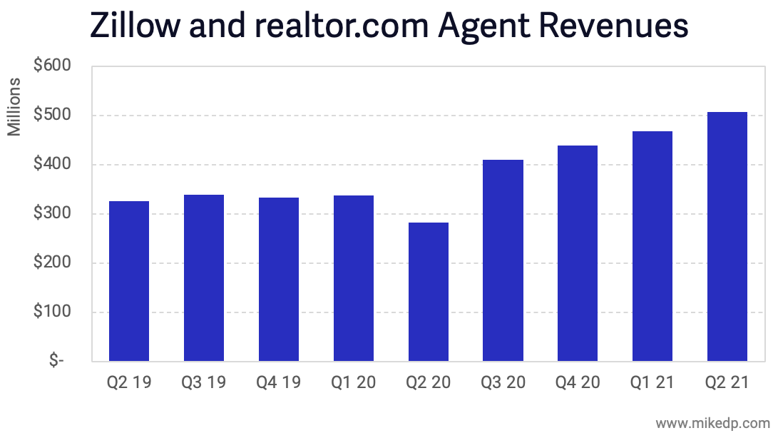While the revenue dominance between Zillow and realtor.com has remained relatively static, the total spend from agents has not. Combined, Zillow and realtor.com have managed to increase agent revenues 55 percent over the past two years, from $327 million to $507 million -- seemingly fueled by the hot market.