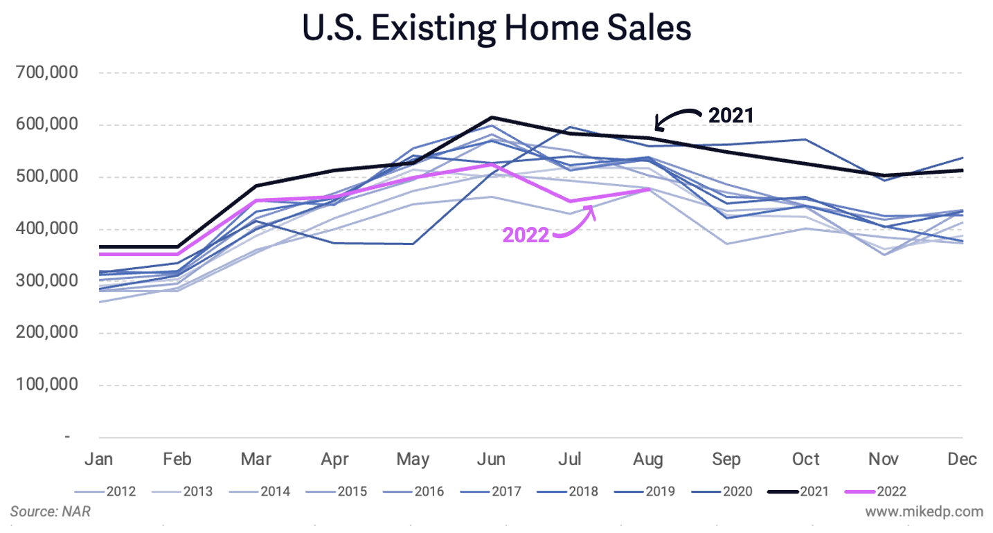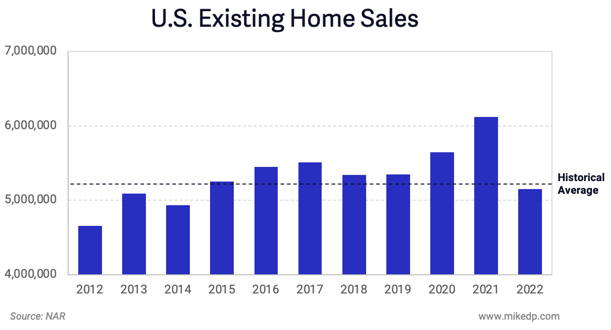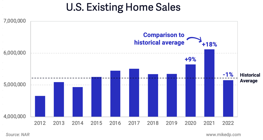 But, if we consider 2021 the outlier and not the benchmark, the market in 2022 doesn't look nearly as catastrophic as headlines suggest.